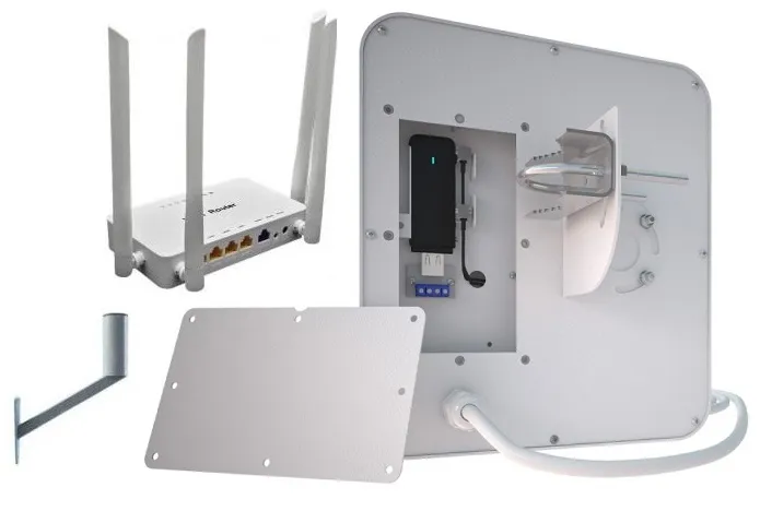 Готовый комплект оборудования для организации стабильного интернета от мобильных сетей сотовых операторов. Комплект оснащен уличной антенной с герметичным боксом, в который устанавливается универсальный модем (работает со всеми оператора сотовой связи). Антенна с коэффициентом усиления до 15дБи, позволяет усилить сигнал в местах, удаленных от базовых станций операторов до 10-15км. От антенны в помещение заводится кабель (10 метров в комплекте) до маршрутизатора. От роутера возможно подключение к интернету множество девайсов (смартфоны, ПК, ТВ, приставки и т.д.). Подключение возможно по беспроводной сети Wi-Fi с частотой 2.4ГГц и до 4-х проводных подключений LAN.
