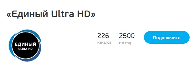 Пакет "Единый Ultra HD" состоит из 228 каналов: 40 каналов в качестве Full HD, 6 эксклюзивных и ярких телеканала в сверхвысокой чёткости Ultra HD 4К (3840×2160). Насыщенные и глубокие краски, еще более четкое изображение, чем в формате Full HD и выразительные детали в вашем телевизоре. Пакет доступен абонентам, чьё приёмное оборудование способно распознавать формат 4K Ultra HD, а телевизор имеет возможность транслировать телеканалы. Fashion One 4K, Insight Ultra HD, Кино UHD, Сериал UHD, #C4K360, Russian Extreme Ultra