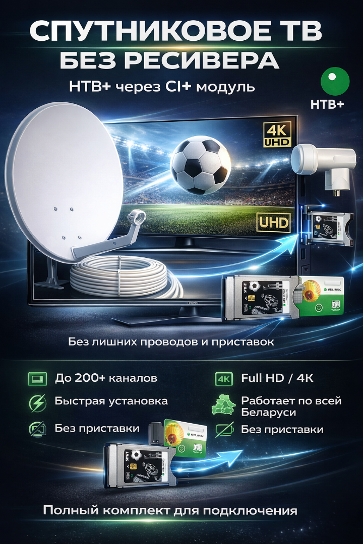 Идеальное решение для современных 4K Ultra HD телевизоров! Комплект с CI+ модулем позволяет смотреть более 200 каналов НТВ-Плюс без лишних проводов и дополнительного пульта. Управление всеми функциями происходит напрямую через ваш телевизор.