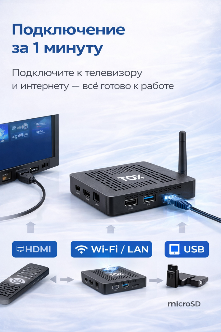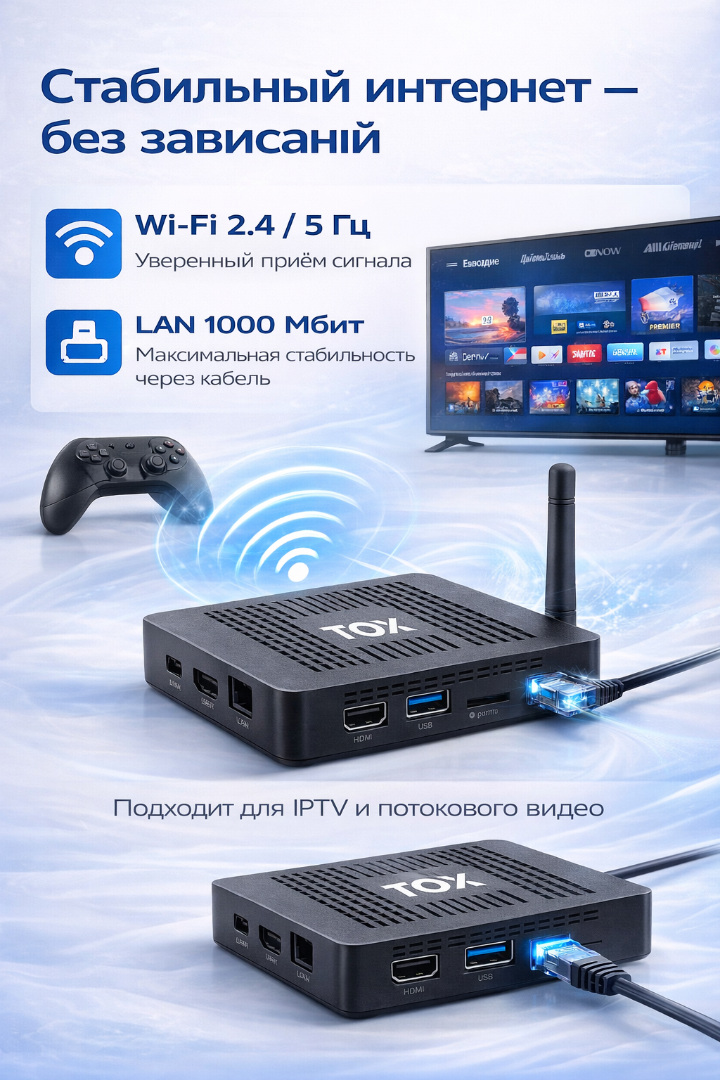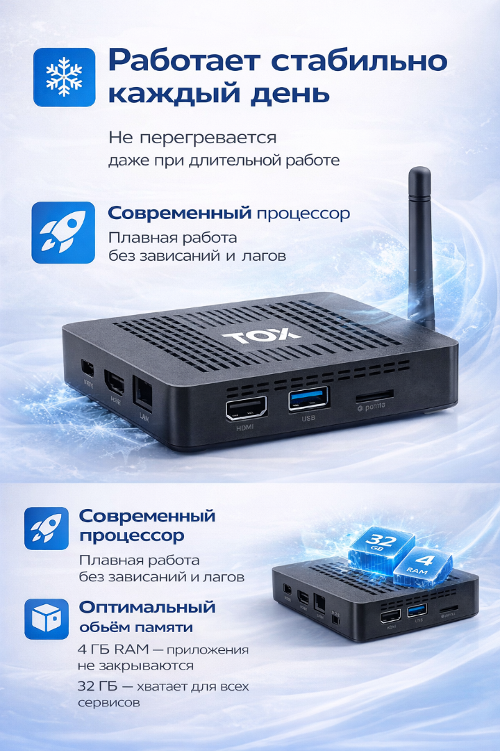 Обновленная смарт приставка TOX3 4/32 – это современное решение для превращения обычного телевизора в умный мультимедийный центр. Благодаря 4 ГБ оперативной памяти и 32 ГБ встроенной памяти, устройство обеспечивает быструю работу и плавное воспроизведение контента.